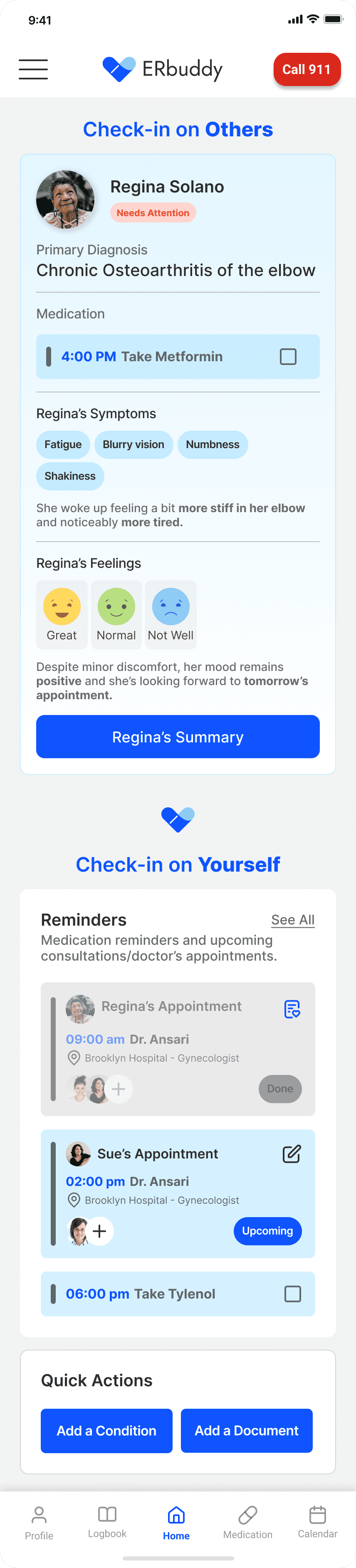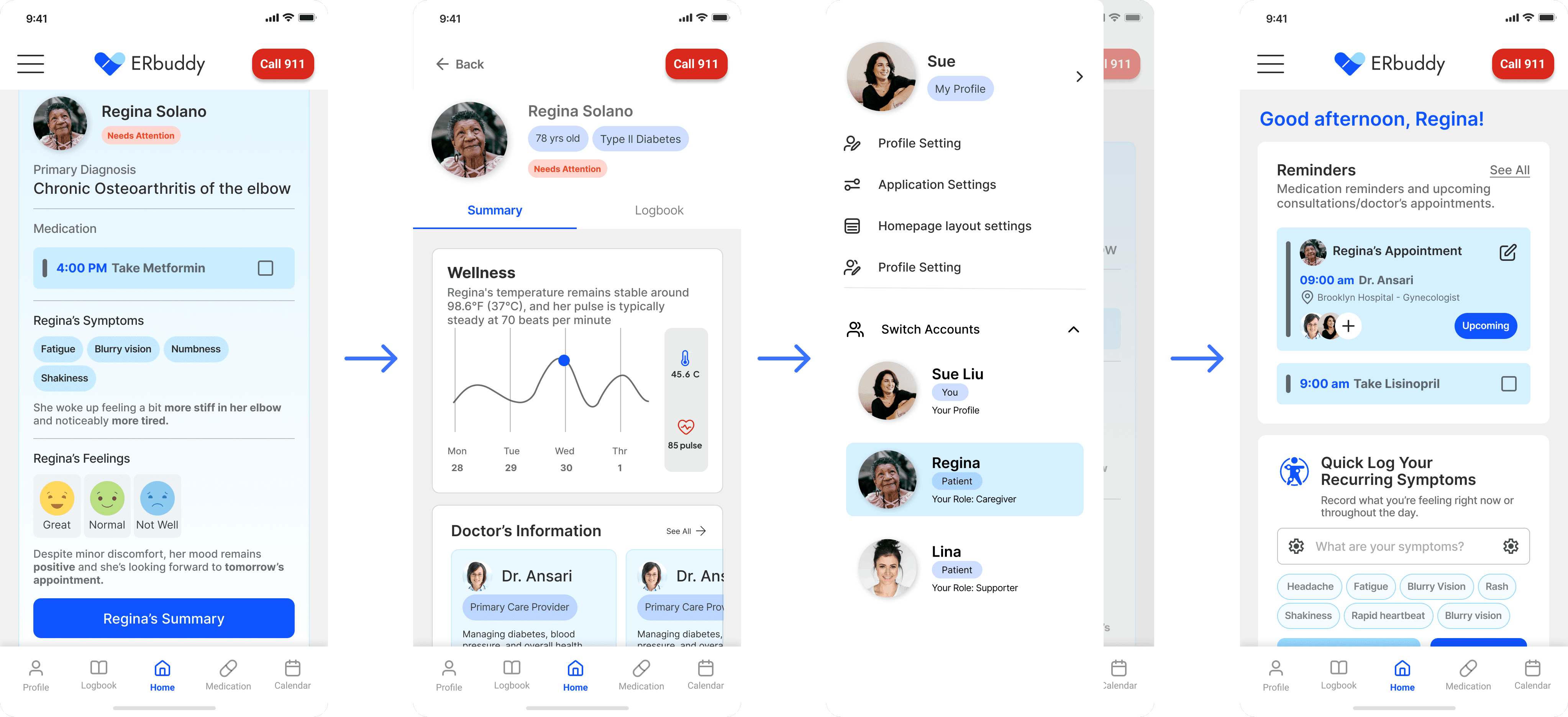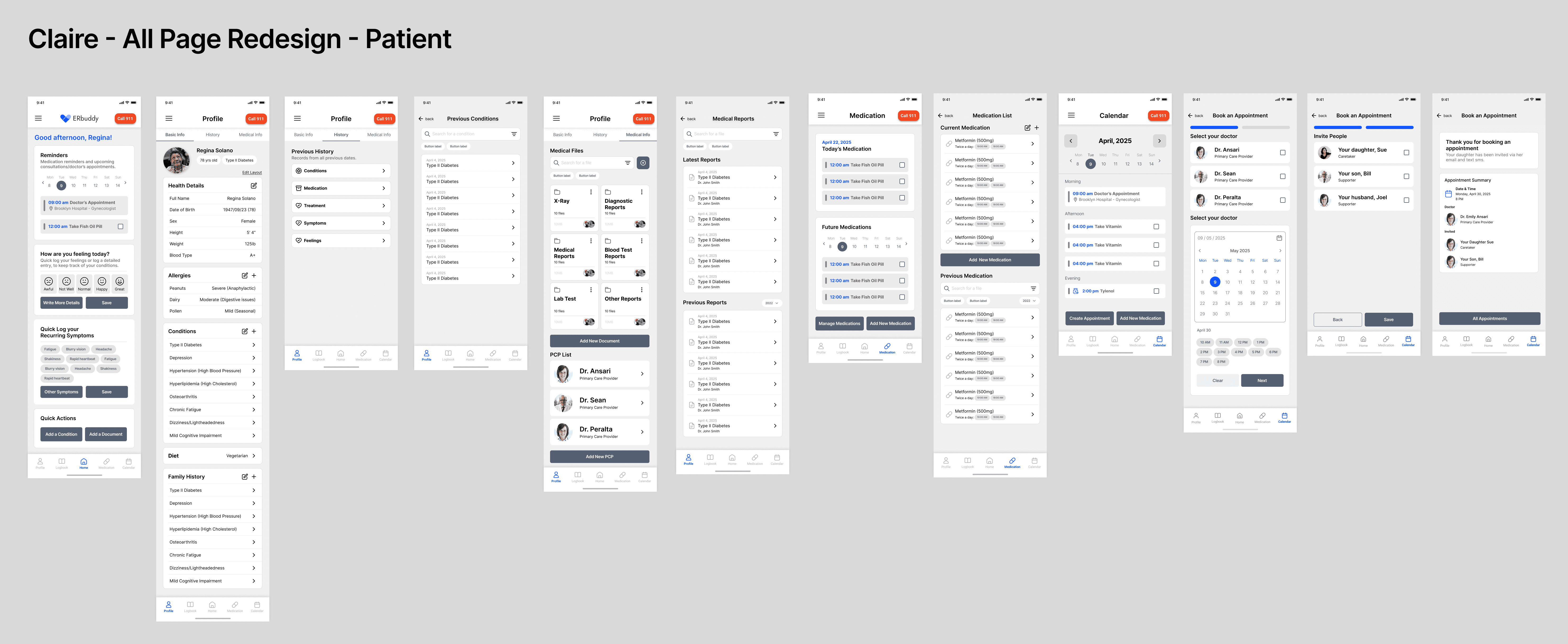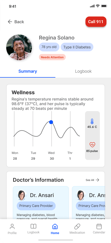 I led research and design for ERbuddy's healthcare app redesign. Restructured IA, designed role-switching and health logging features, and validated solutions through usability testing with target users.
