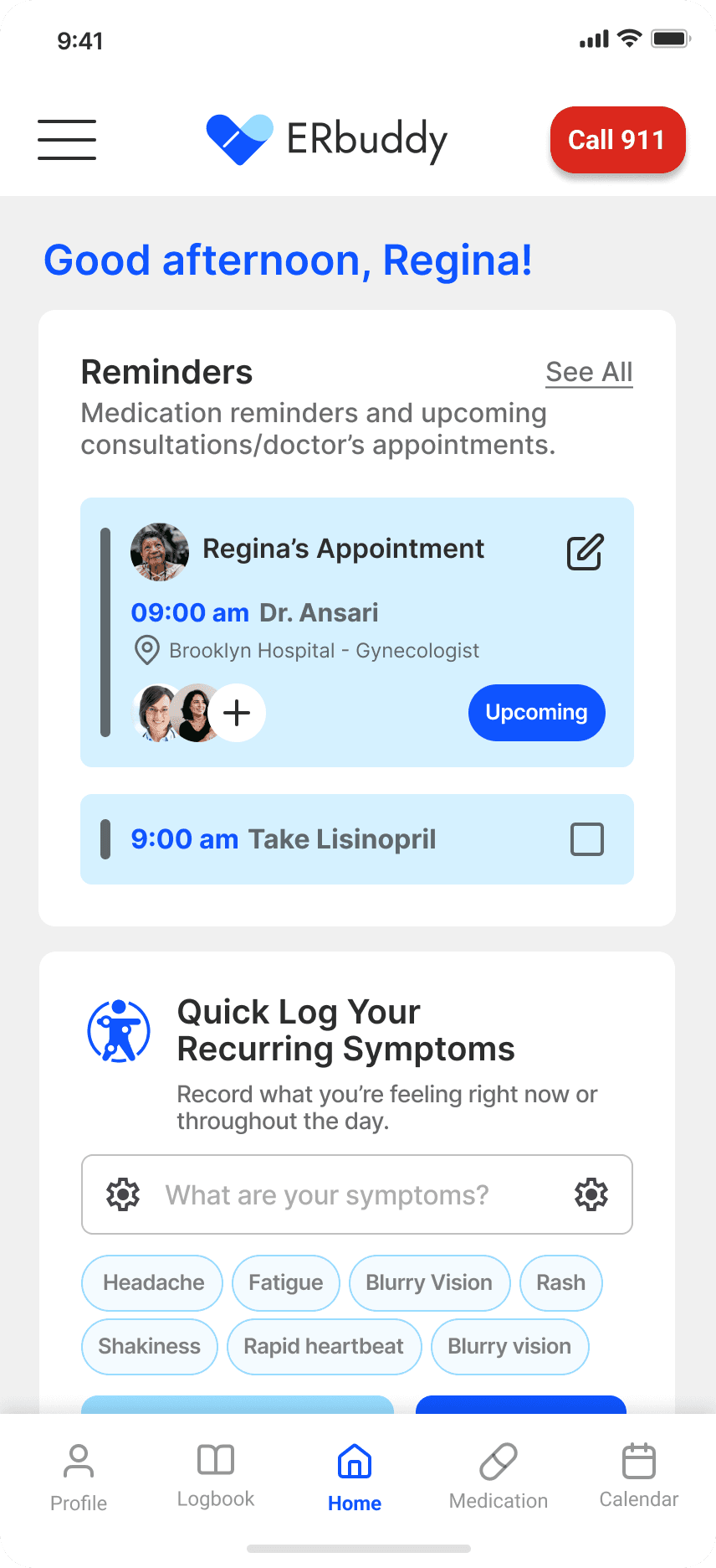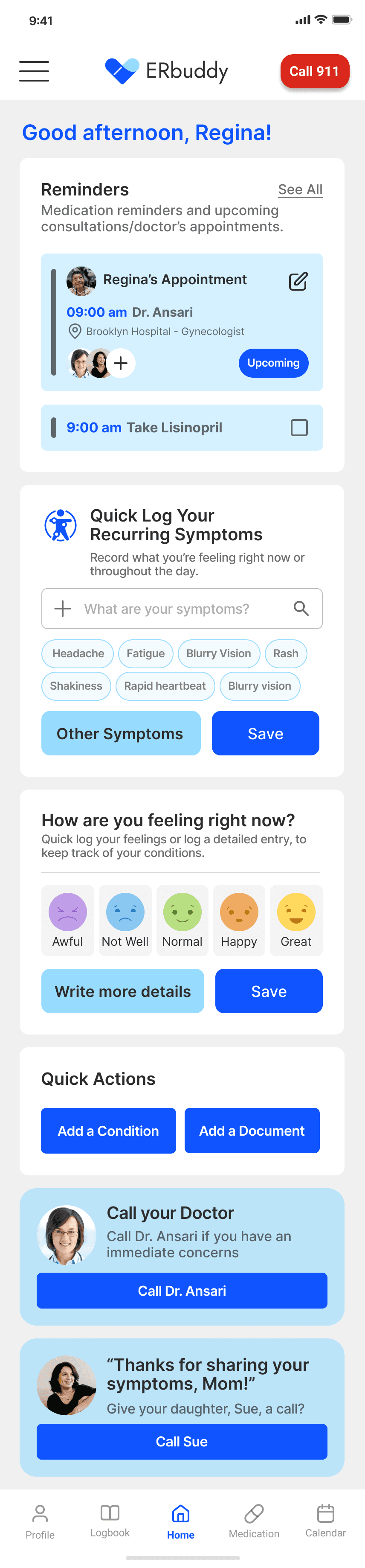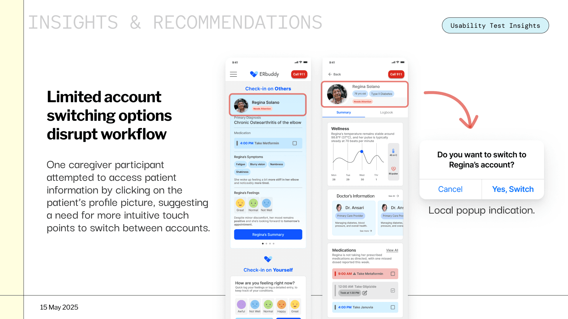 I led research and design for ERbuddy's healthcare app redesign. Restructured IA, designed role-switching and health logging features, and validated solutions through usability testing with target users.