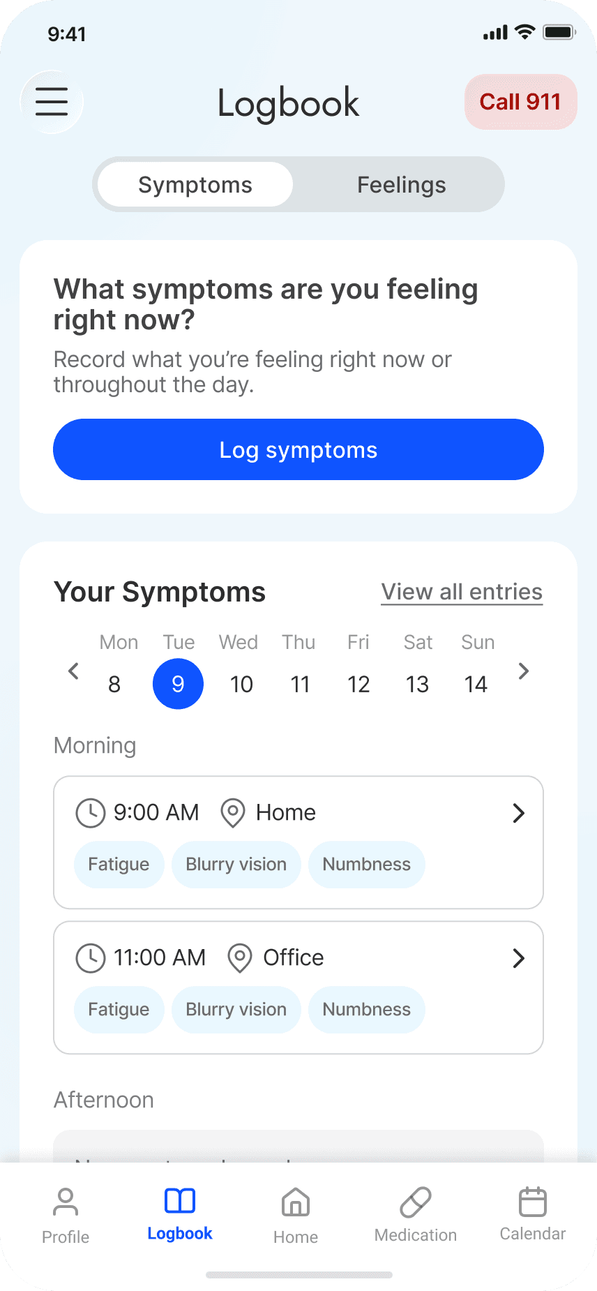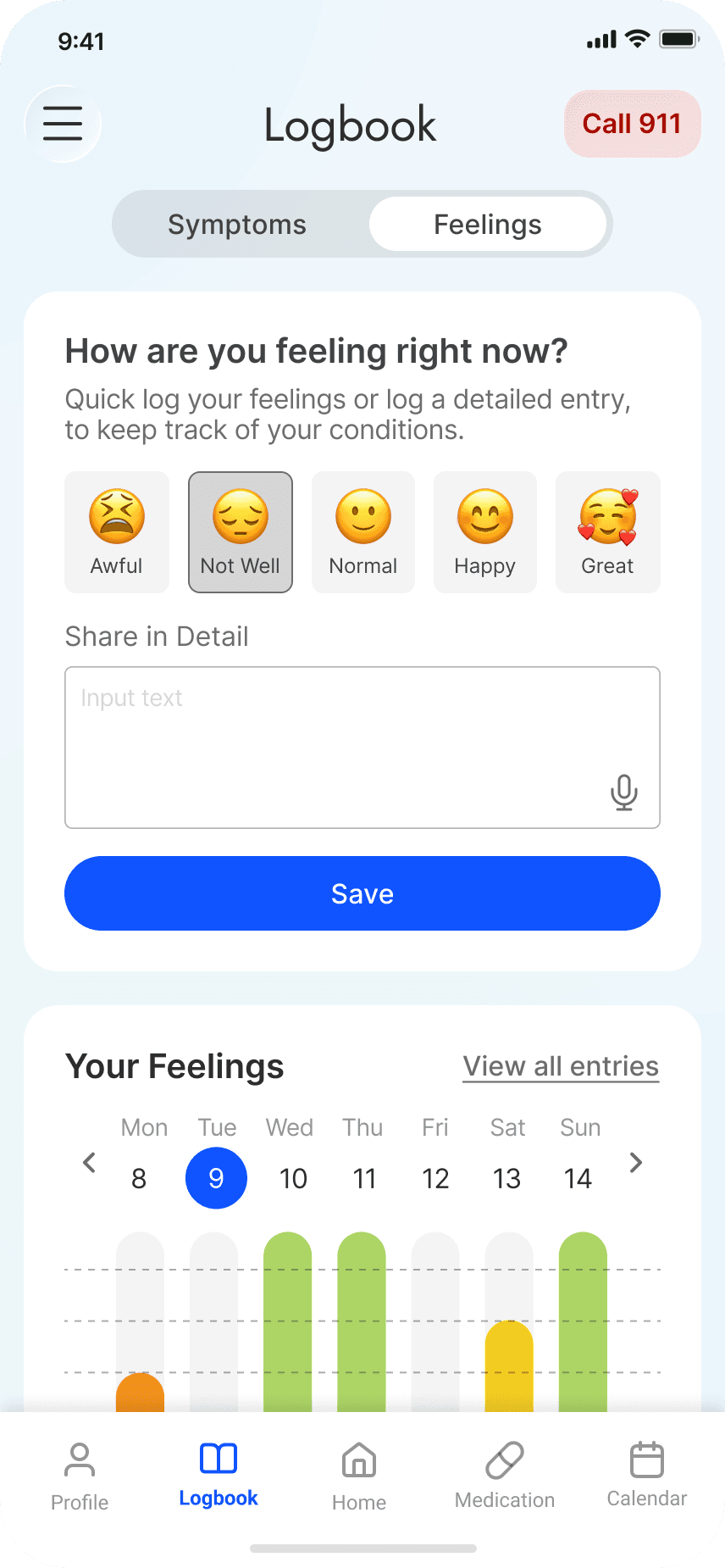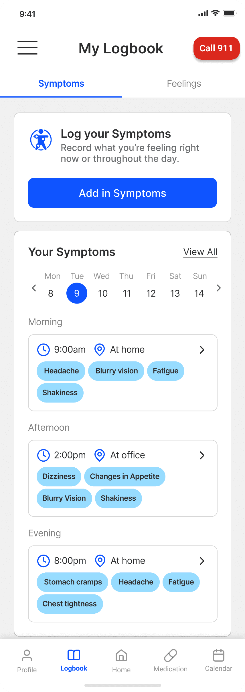 Symptoms and feelings logbook