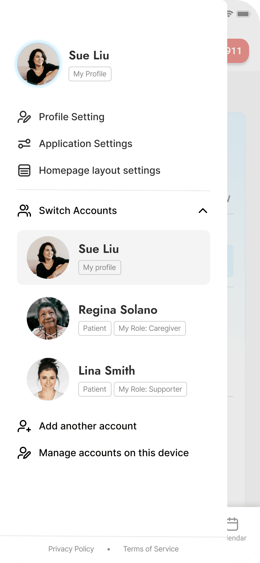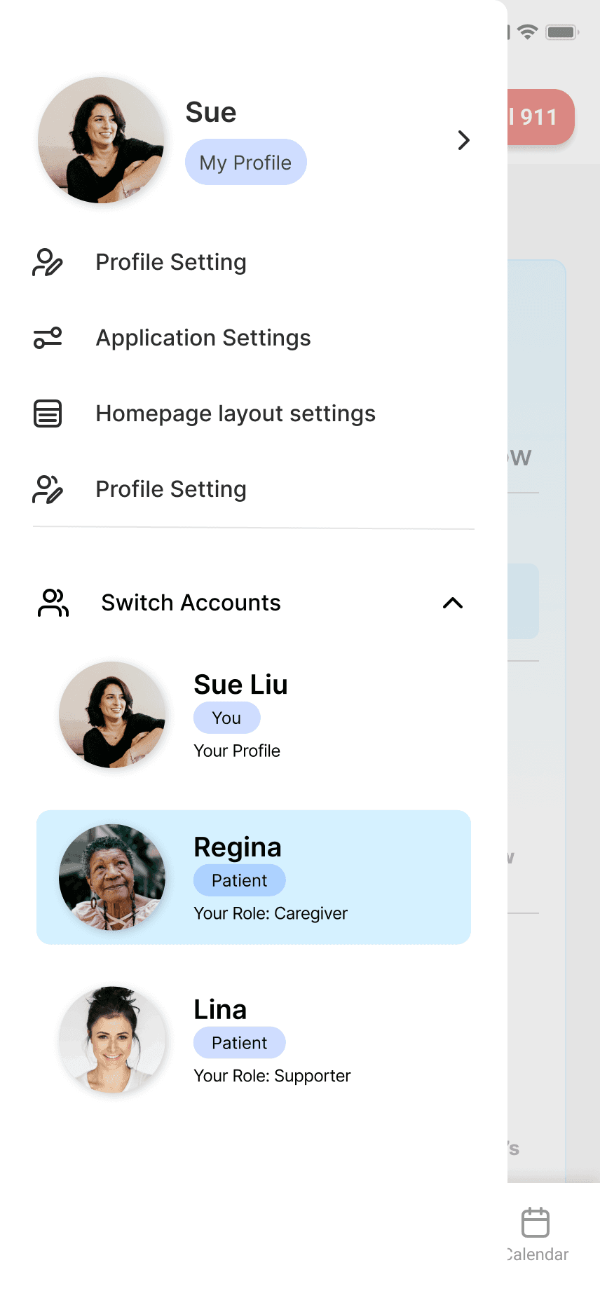 Caregivers were managing both their own health and their patients', but didn't have a practical and centralized way of governing both. So, we introduced role-switching that let caregivers: