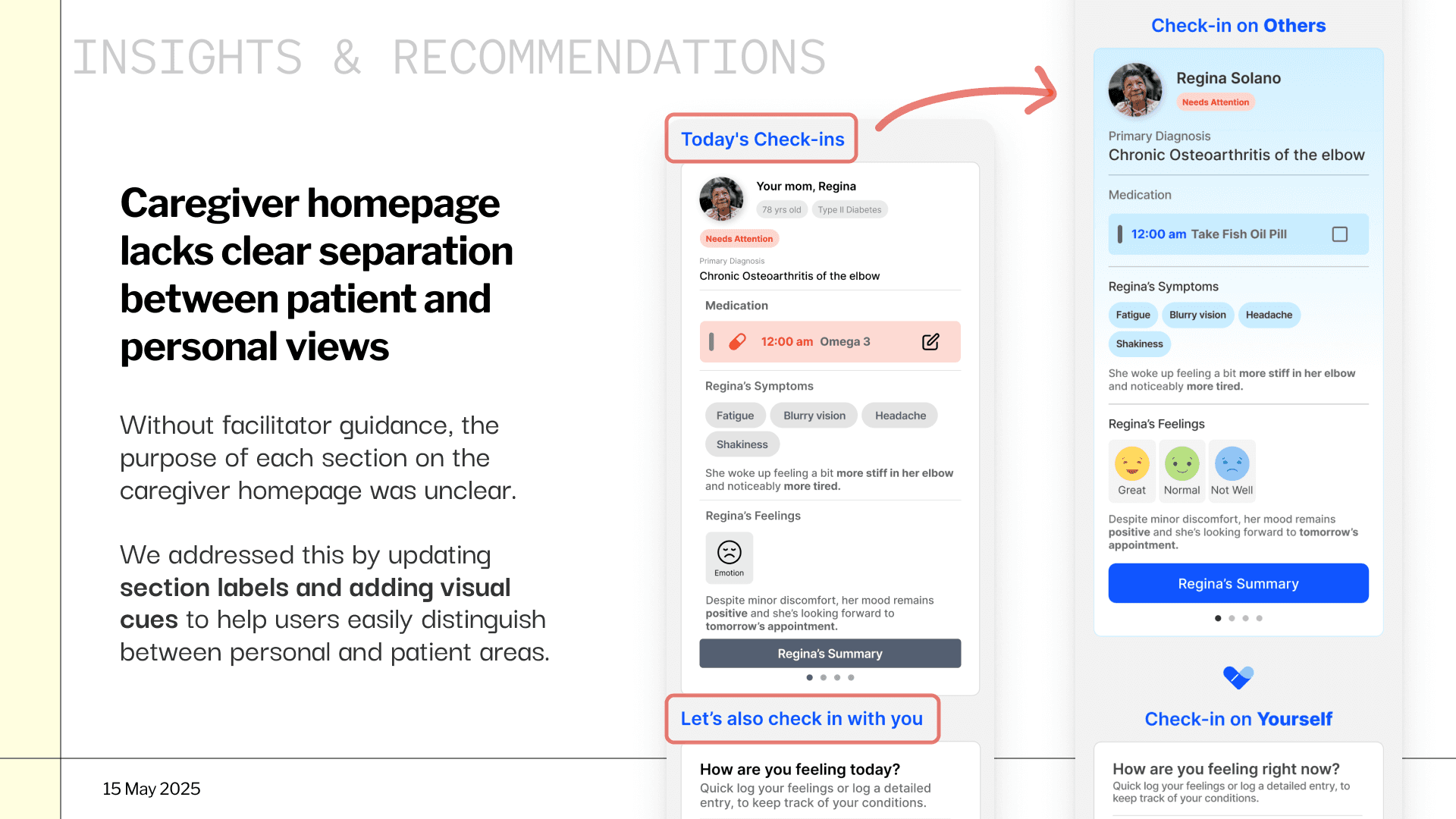Caregivers manage both their patients' health and their own. We brought patient status summaries onto the caregiver homepage so they could monitor both without switching views.