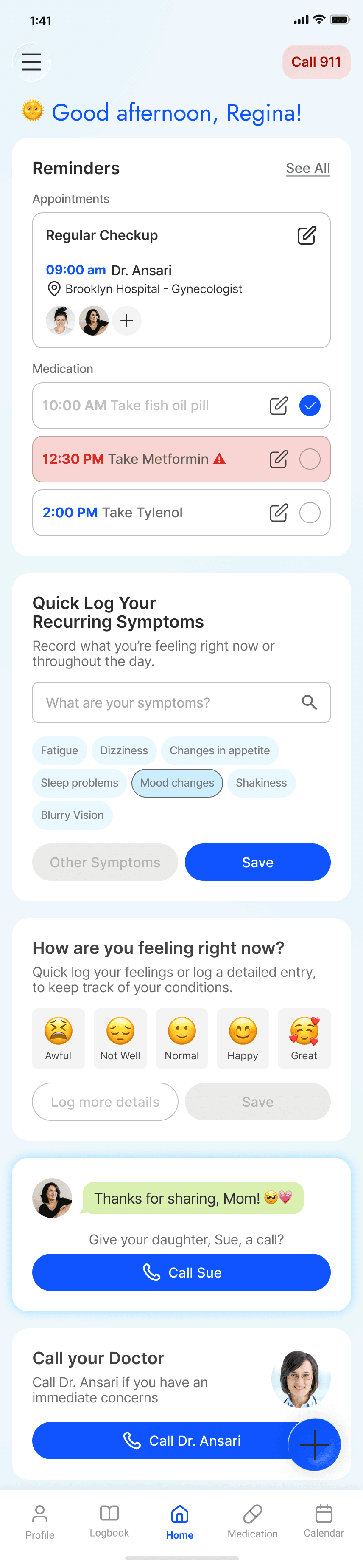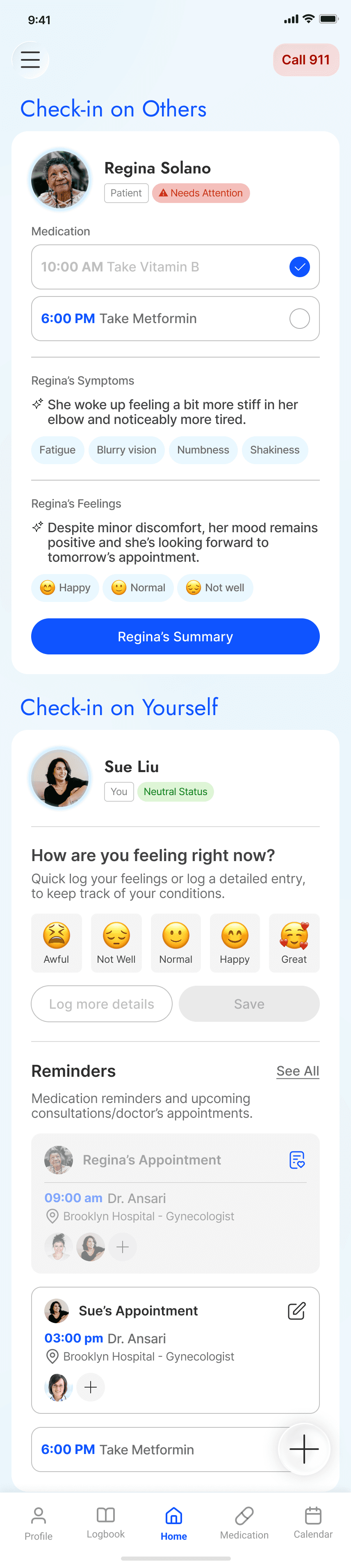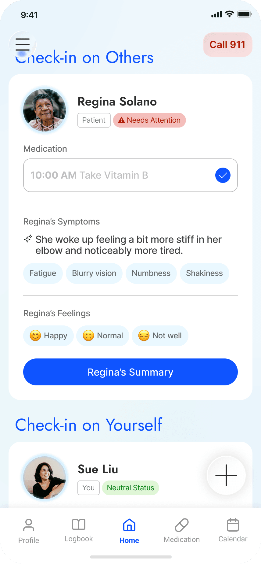 Track symptoms and feelings patterns and share real-time updates with caregivers.