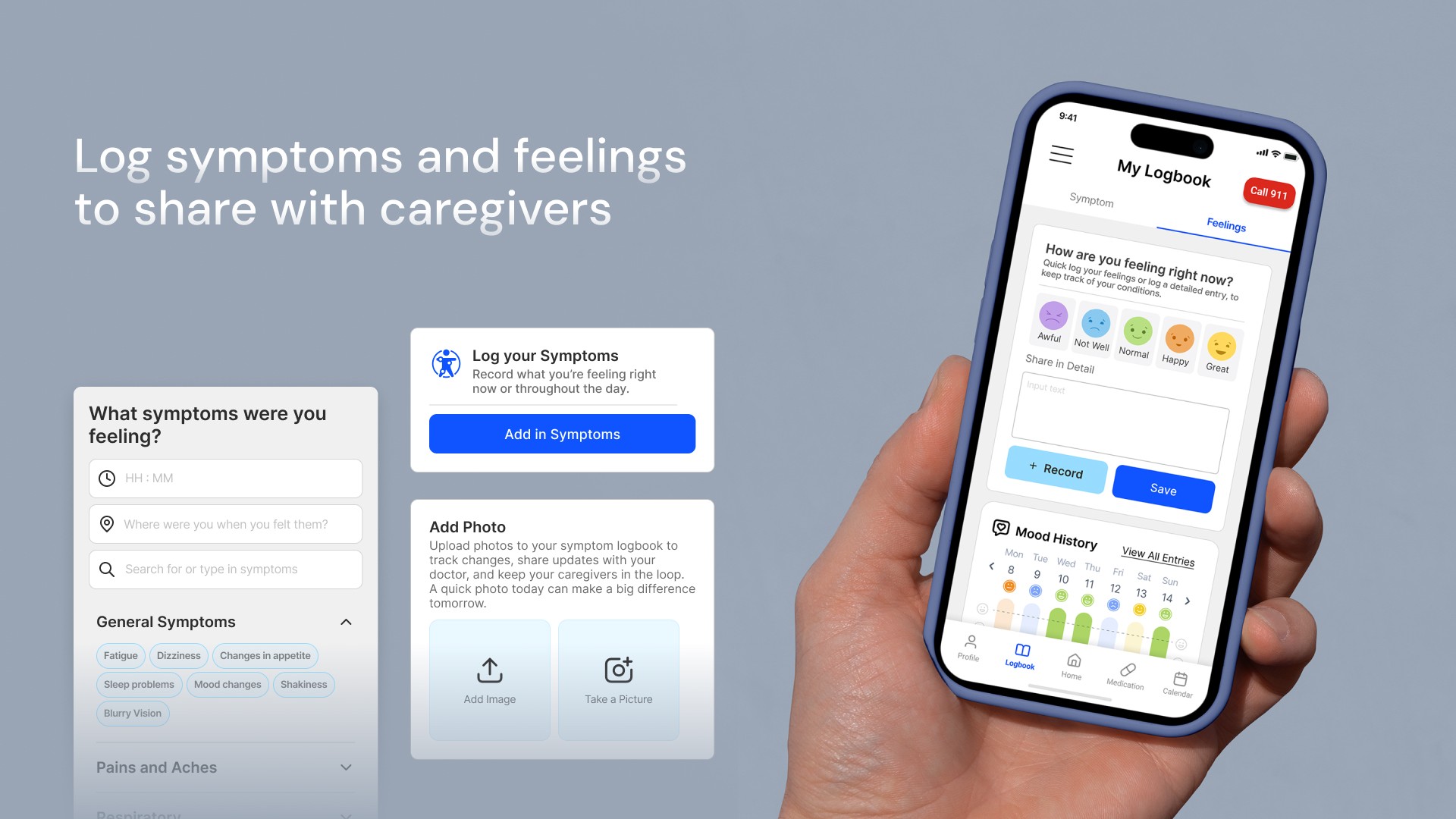 Caregivers struggled to understand what patients were experiencing day-to-day, making it hard to provide appropriate support or communicate with doctors. We designed a logbook that captures both: