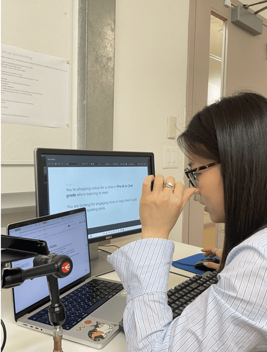 We conducted eye-tracking usability tests with Tobii Pro Lab in the Pratt Institute Eye-Tracking Lab, with each participant completing a set of realistic shopping tasks designed to reflect common user goals: