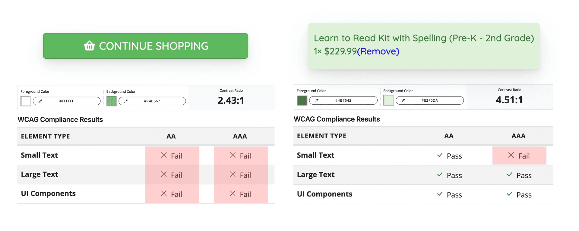 WCAG standards analysis confirmed that CTA contrast levels did not meet AA compliance, and product titles did not meet AAA compliance.